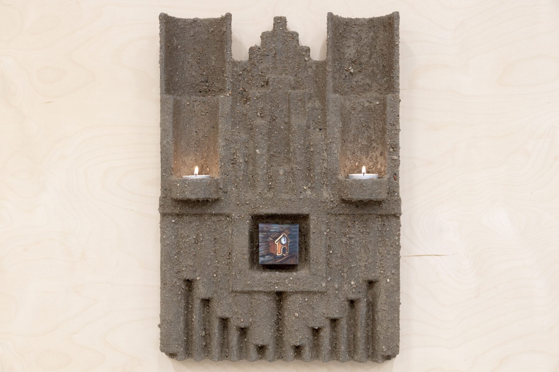 Printed ink and acrylic on canvas, pine wood, staples, PLA, cement mix, PVA, water, tealights, bolt, screw, glue, 45 × 31 × 8 cm, 2025
