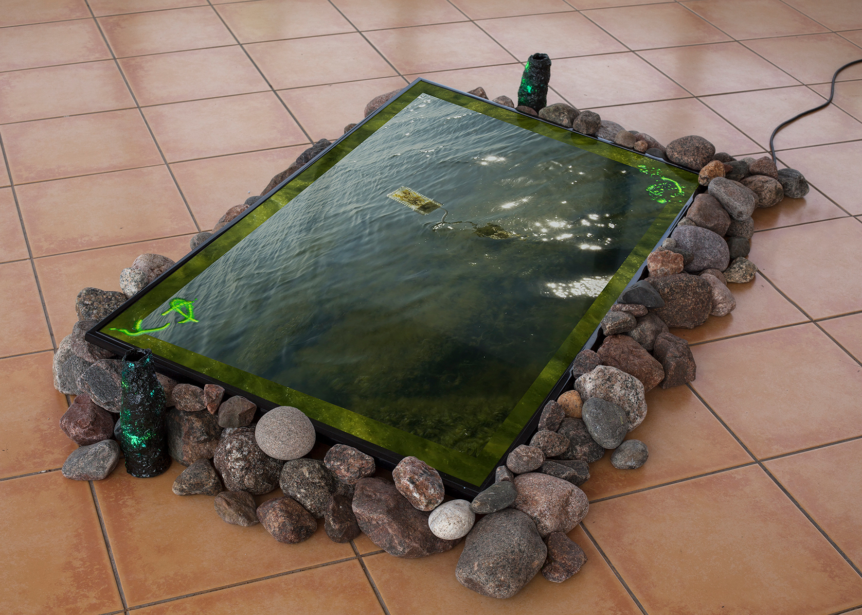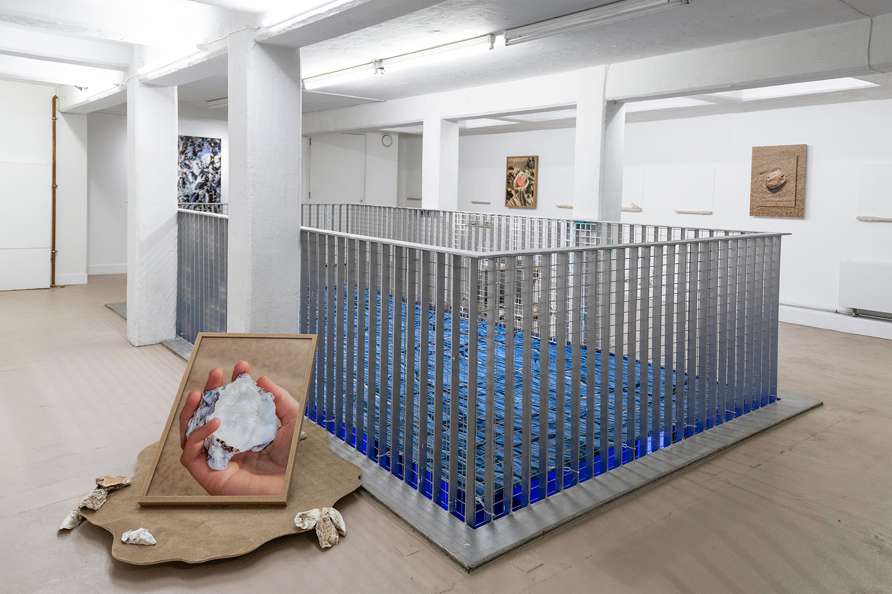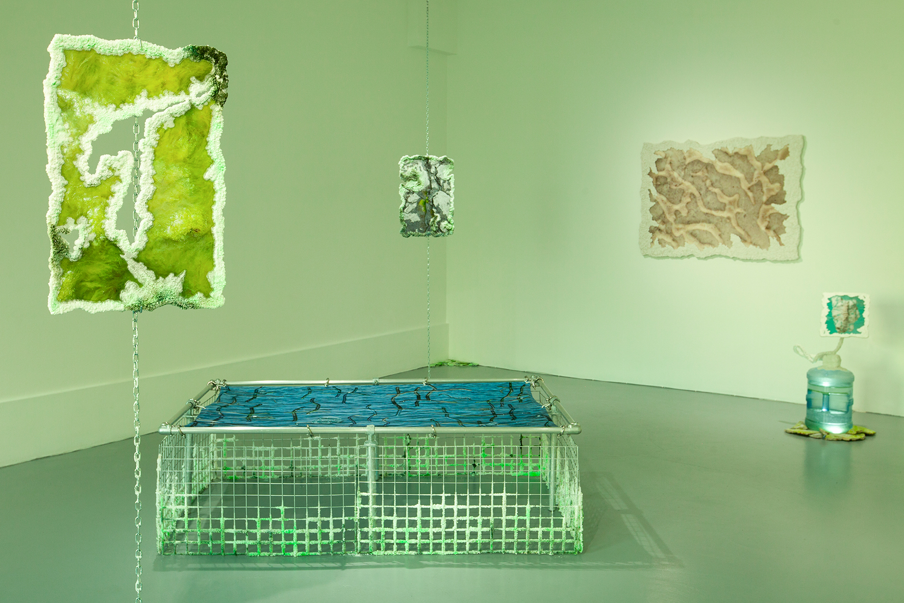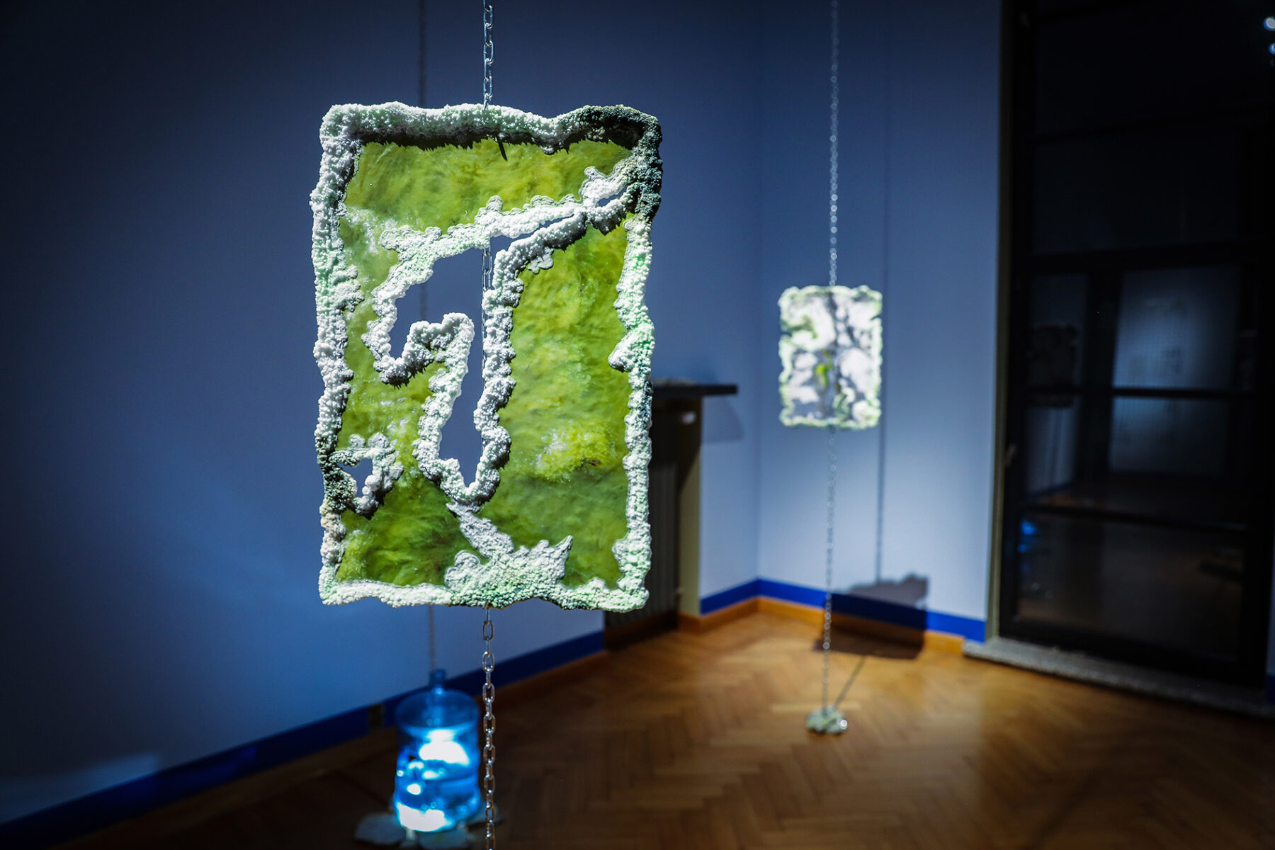Kristina Õllek. Borealis Borealis, From the Depths of Silurian Times, Meeting The Baltic Sea Water. View from the solo exhibition Waters of Hypoxic Slime & Tropic Lime at Kogo gallery, Tartu, Estonia, 2023. Photo by Marje Eelma