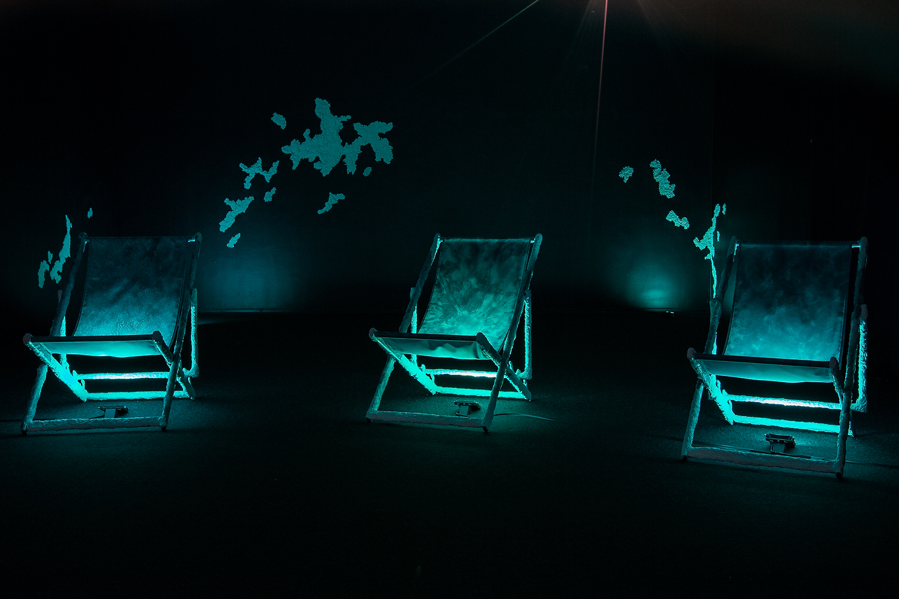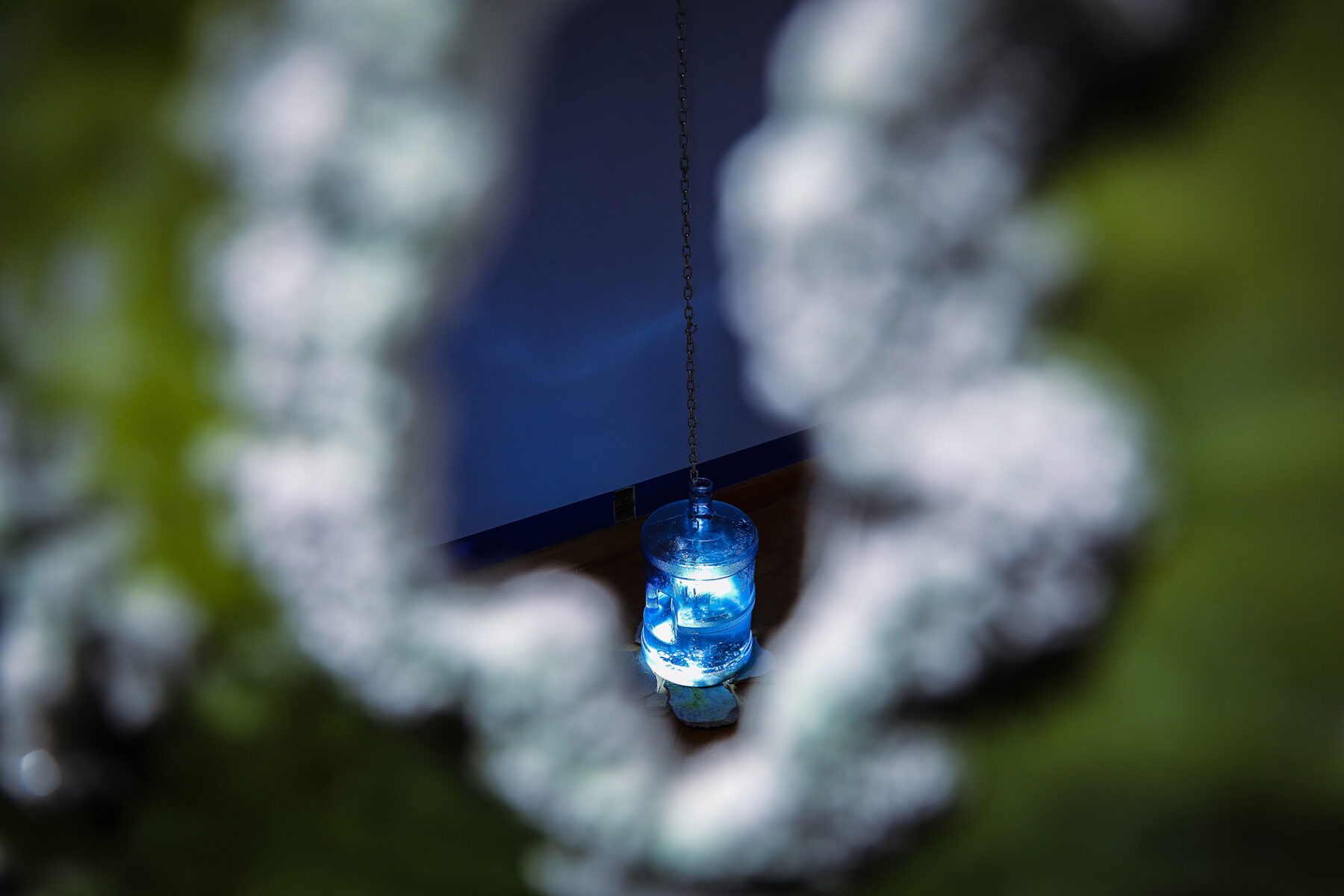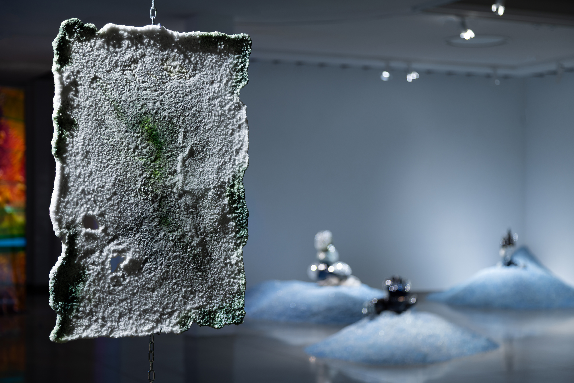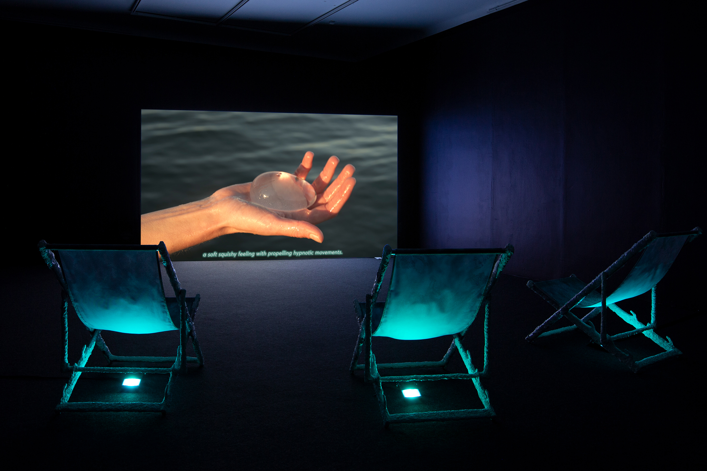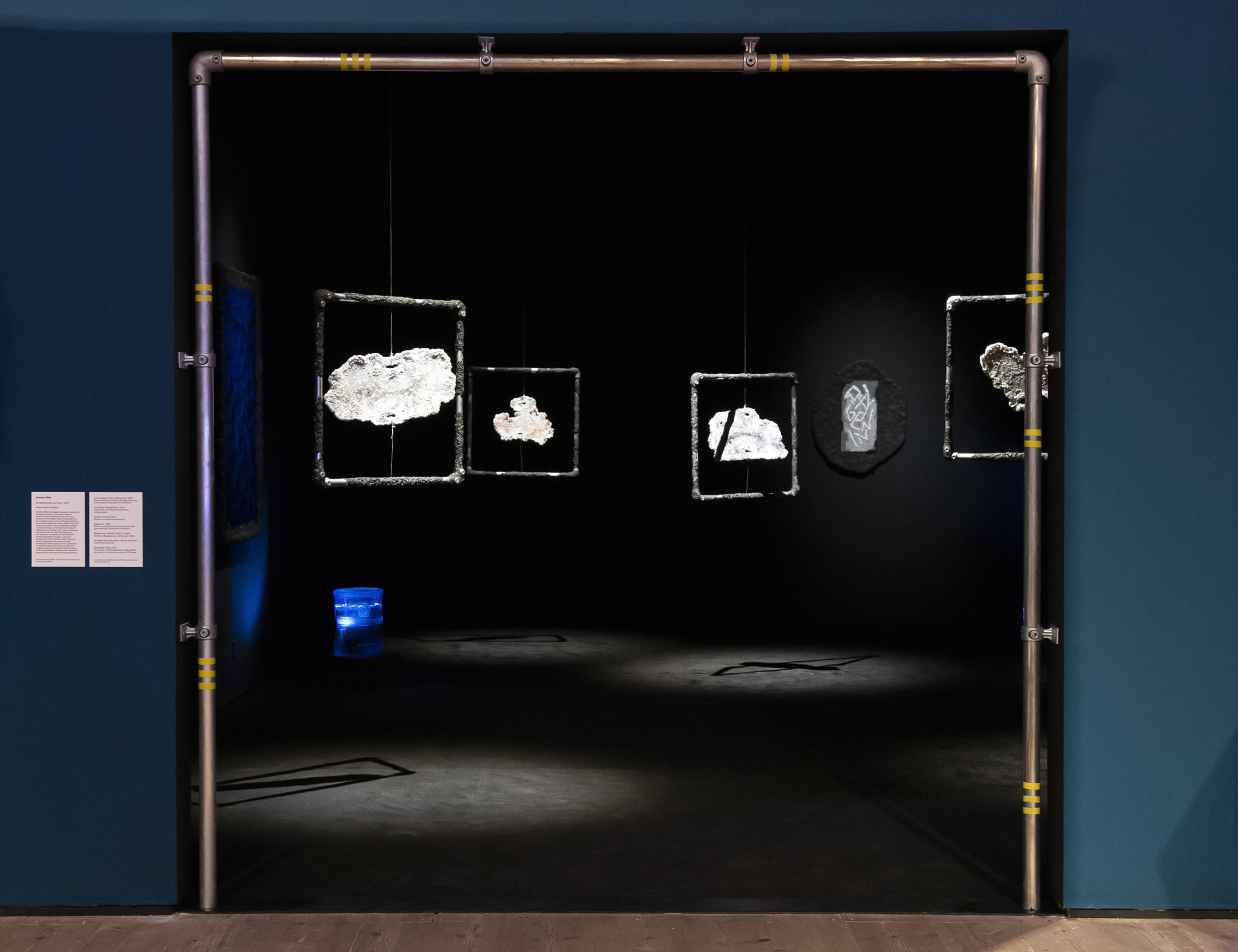 Kristina Õllek. Borealis Borealis, From the Depths of Silurian Times, Meeting The Baltic Sea Water. View from the solo exhibition Waters of Hypoxic Slime & Tropic Lime at Kogo gallery, Tartu, Estonia, 2023. Photo by Marje Eelma