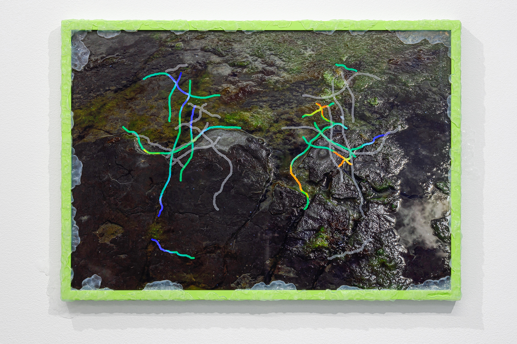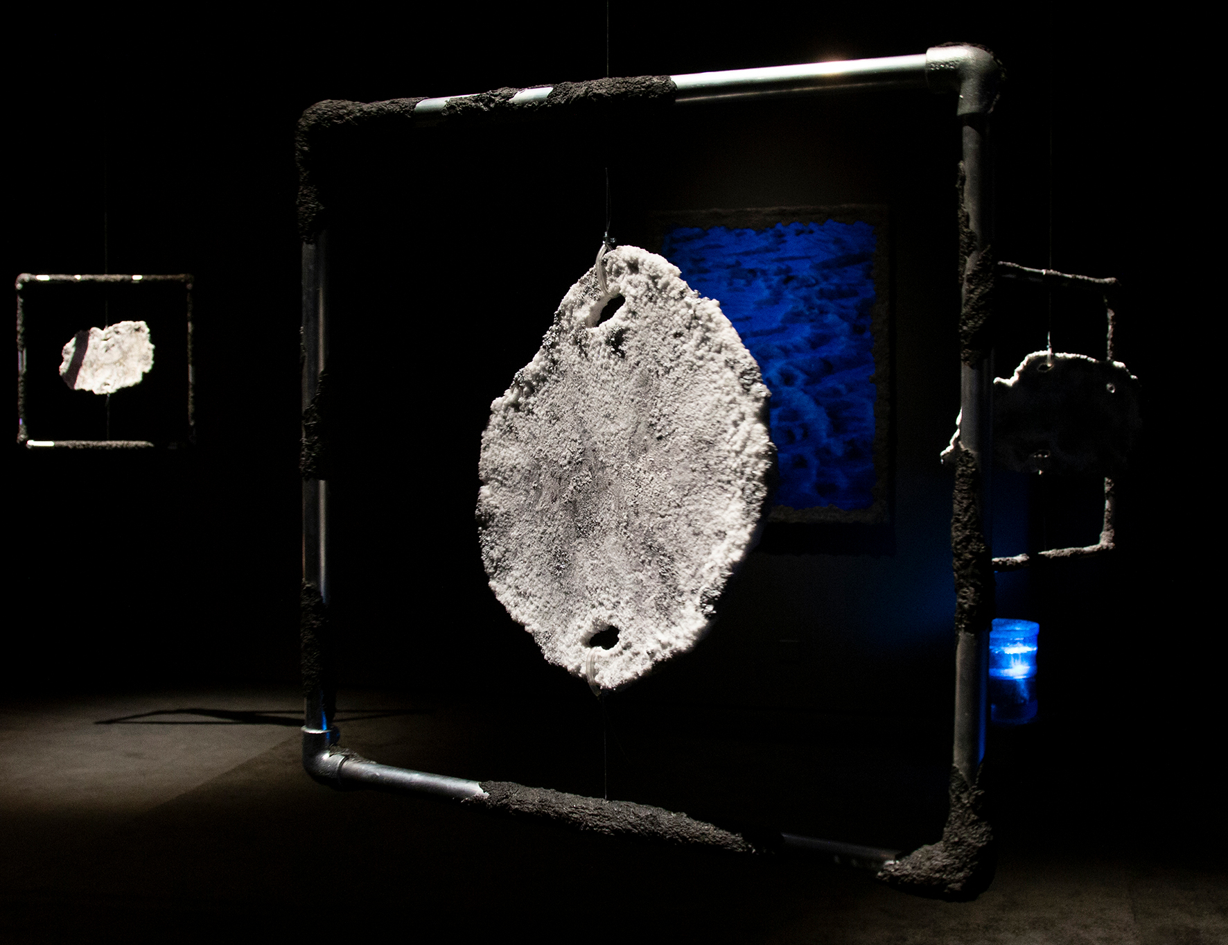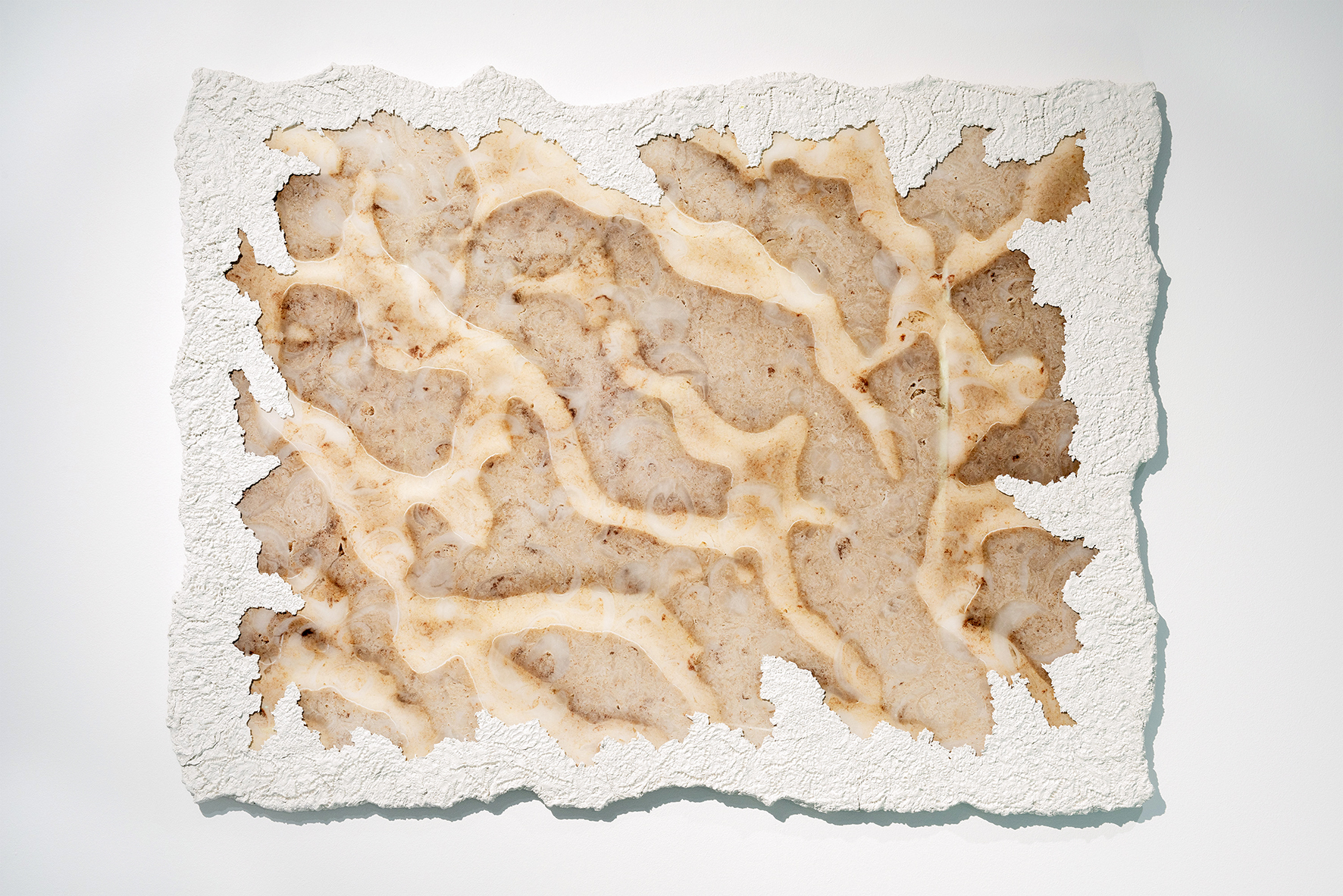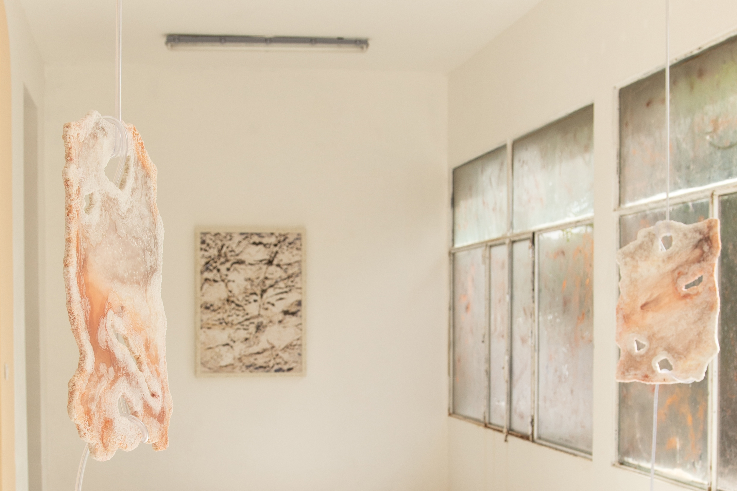 Kristina Õllek. Surface Accumulation no.1. View from the solo exhibition Filtering With Cyanobacteria, Double Binds & Other Blooms at ISSP gallery, Riga, Latvia, 2022. Photo by Kristina Õllek
