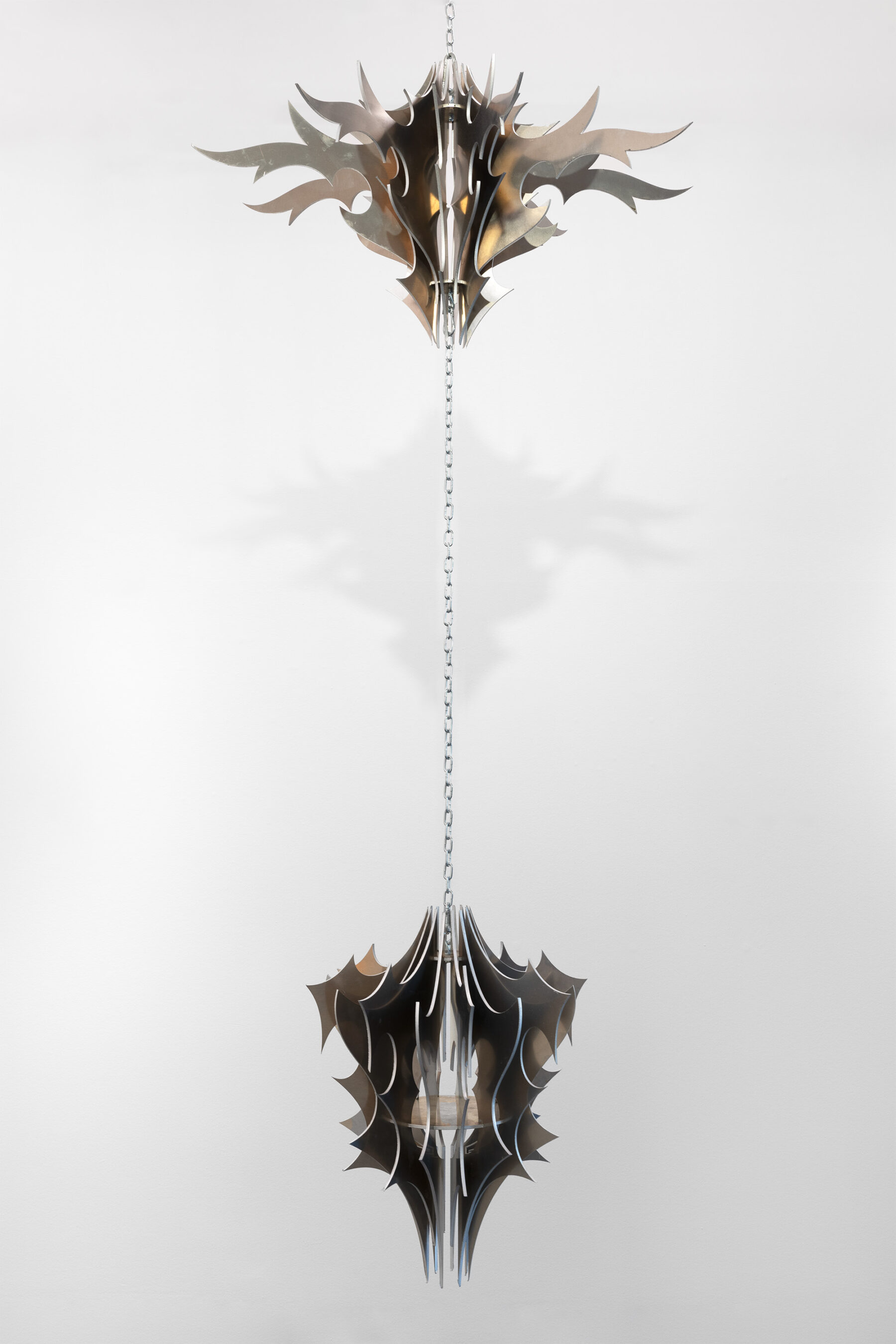 Iron, plastic, ribbon, glass, silver chain, acrylic nail, contact lens, 210 x 190 cm, 2023
