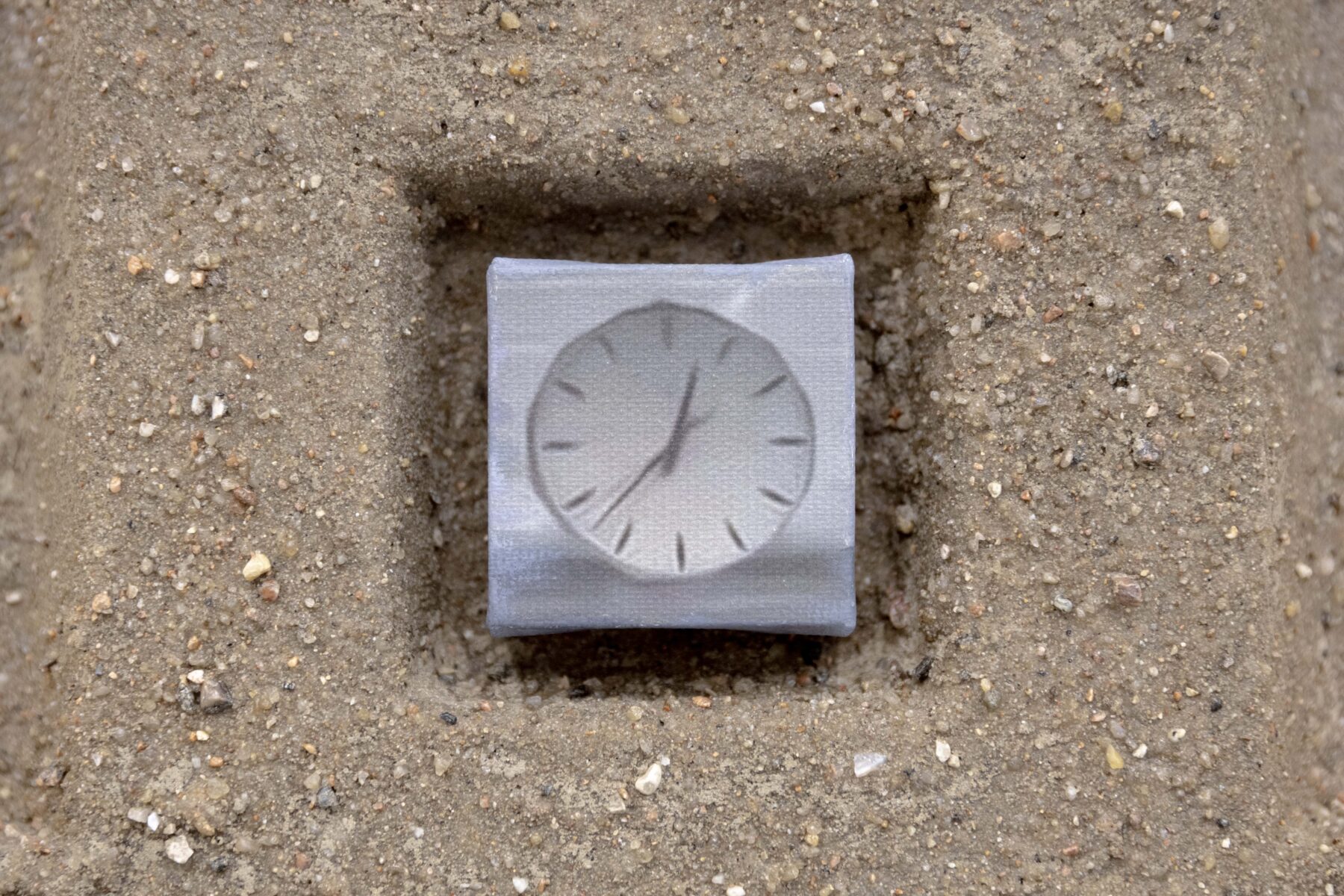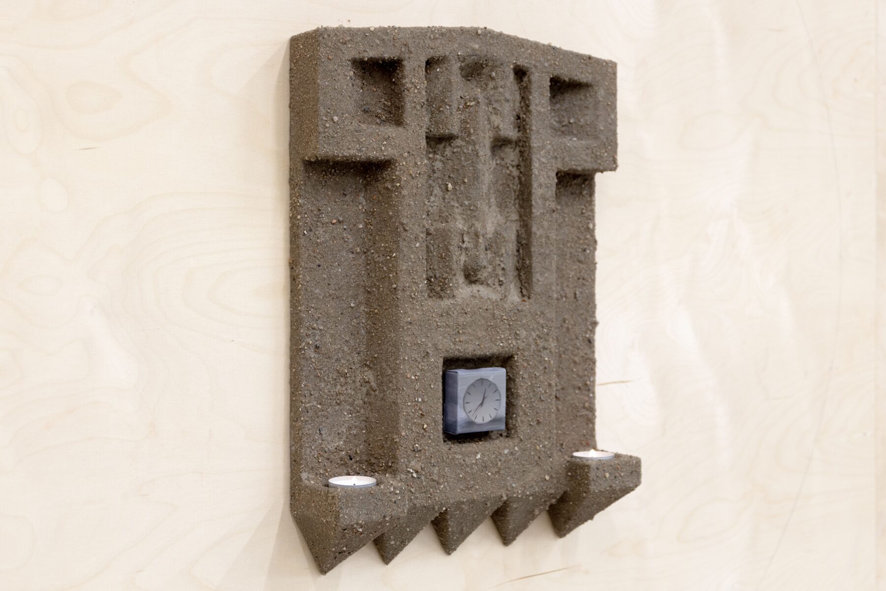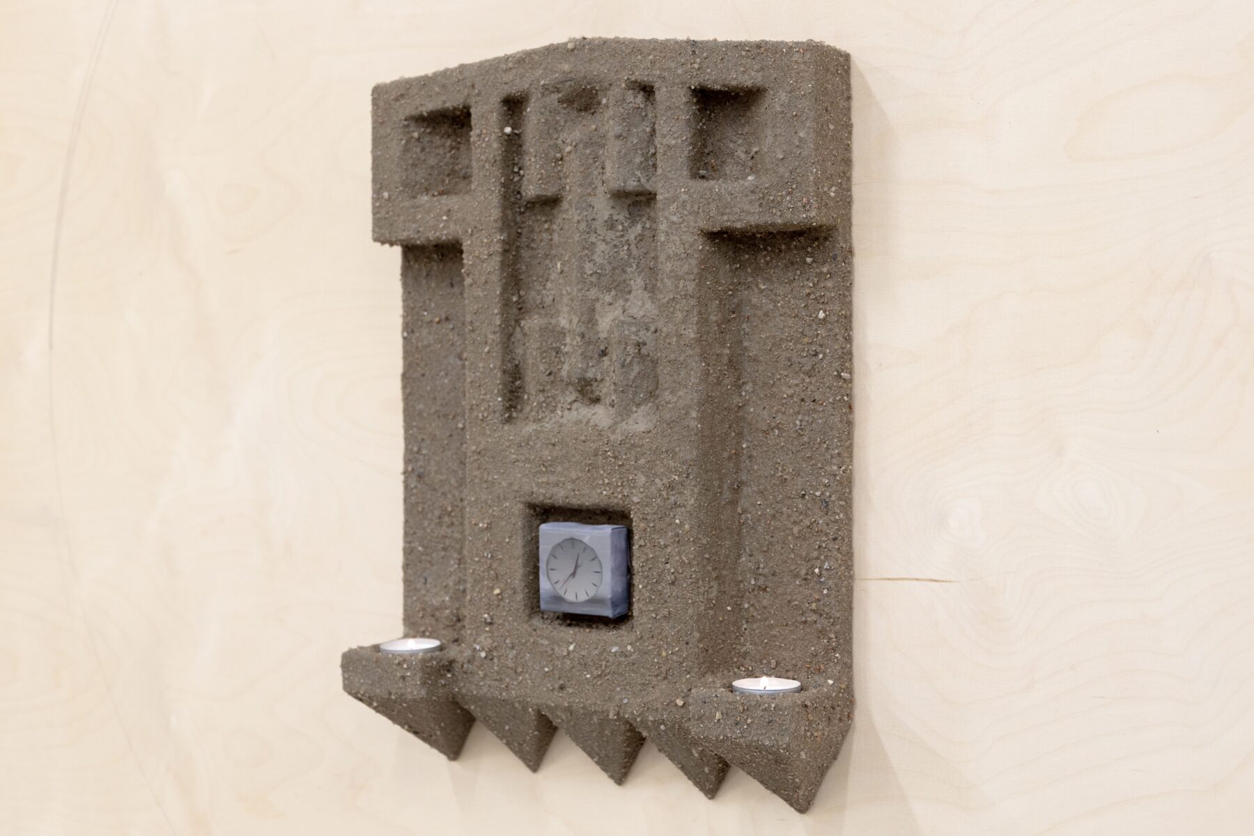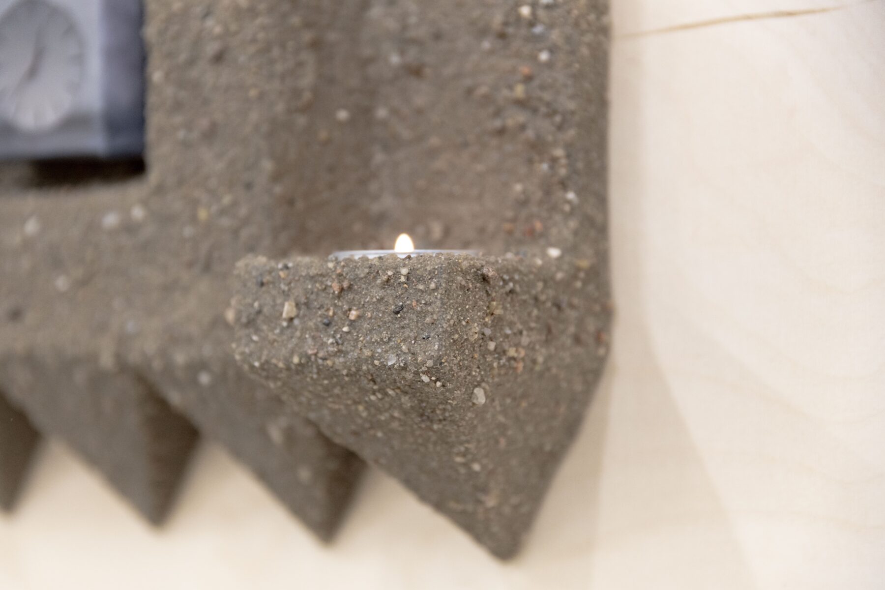 Printed ink and acrylic on canvas, pine wood, staples, PLA, cement mix, PVA, water, tealights, bolt, screw, glue, 45 × 31 × 8 cm, 2025